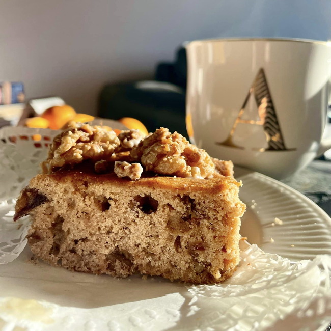 Now not everyone is a fan of almond so my next choice is a nut of a different kind, date and walnut with candied walnut topping. To make candied walnut topping place castor sugar in a non stick frying pan and heat gently as it starts to liquidise take off the heat and toss some crumbled walnuts in it and quickly as to the top of your cake. I made this as a lighter alternative to Christmas cake for my husband, he is not a huge cake person, as in he is not a fan of cake not a huge cake person! He wolfed it down which is praise indeed.