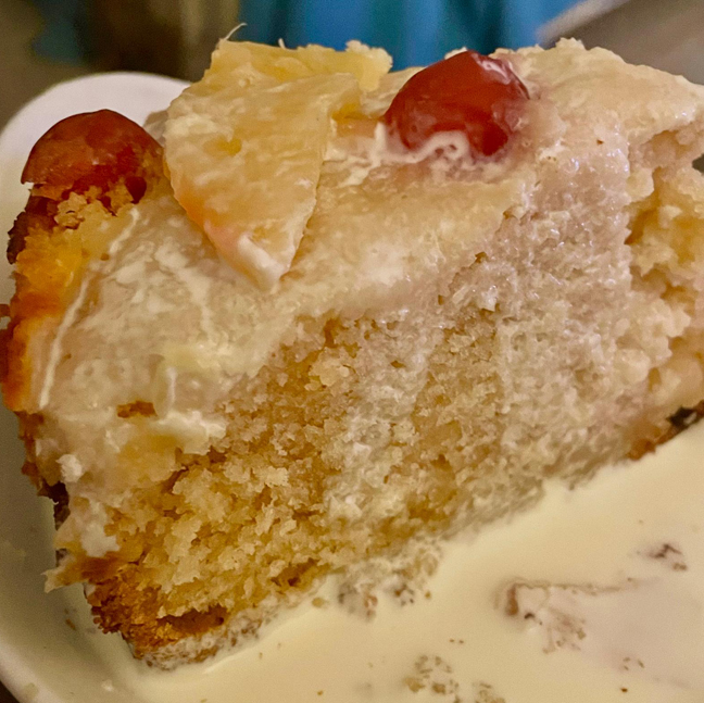 Not to be outdone and to keep with the fruity theme a pineapple and coconut cake, again I adapted it a little decorating with glace cherries and toasted pineapple, here its served with cream but it would be at home in a pool of custard or for vegans a sweet almond sauce made with almond milk, vanilla and cornflour. You could ditch the custard and instead make up some plain glace icing mixing icing sugar with a little milk or nut milk until it is just runny enough to cover the top without running off the sides then sprinkle with toasted dessicated coconut. Get creative!